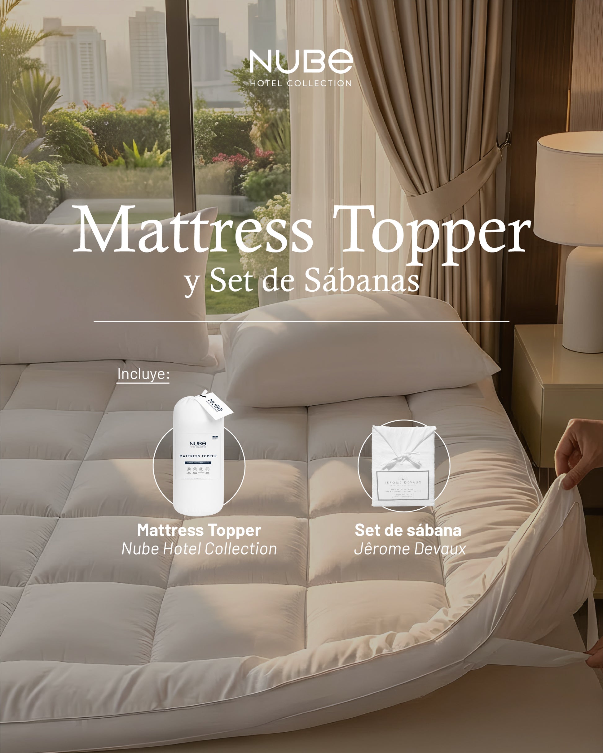 El Mattress Topper Nube añade una capa acolchada que transforma la cama, mientras el set de sábanas Jerôme Devaux aporta frescura, caída impecable y confort continuo.