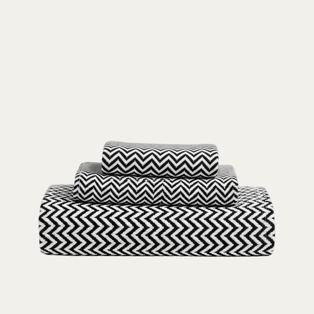 Un set de toallas de baño con presencia. Su diseño minimalista resalta por el contraste en negro que enmarca cada pieza. Confeccionadas en algodón de alto gramaje, estas toallas ofrecen una sensación envolvente y una textura densa, perfecta para quienes buscan un secado confortable.